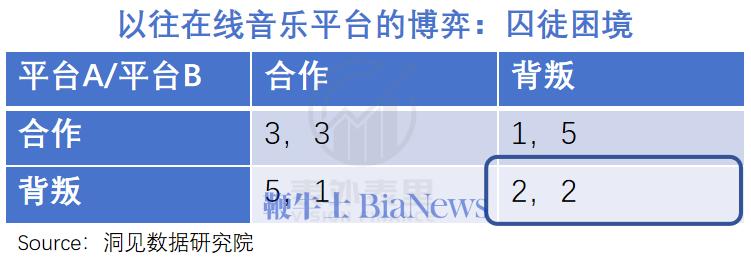商人逐利的天性,会驱使平台都想做赢面最大的独占“背叛方”,形成博弈论里典型的“纳什均衡”。于是,为“一首歌抢破头”成了行业常态,平台版权费用一度逼近年营收1/3。