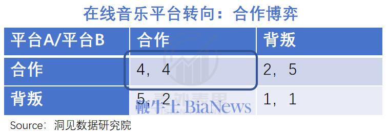 为了方便理解平台间的博弈关系,我们假设有在线音乐平台A和B,双方共享版权写作“合作”、独占版权为“背叛”,可以分析出不同选择下的收益情况: