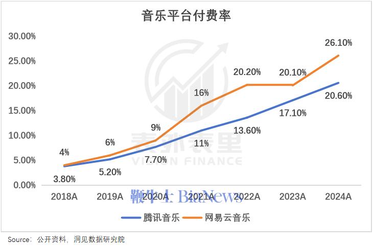这样一来,“为内容付费”的用户心智,逐渐被合力塑造起来。如下图,TME和网易云的付费率在过去几年间稳步提升,平台盈利模型得到初步修复。