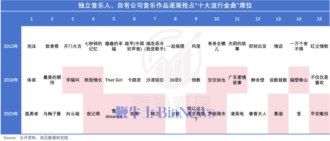 可以看到,2013-2023年十大流行歌曲榜单中,大唱片公司上榜歌曲递减,来自独立音乐人、自有公司的作品逐渐占据半壁江山。