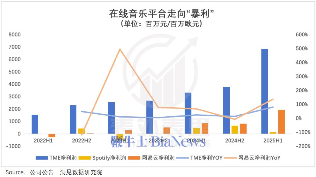 平台业绩随之起飞,TME最新一季营收同比增长17.9%,净利润拉升33%至26.4亿元;网易云上半年运营利润达9.05亿元,同比大增35%。