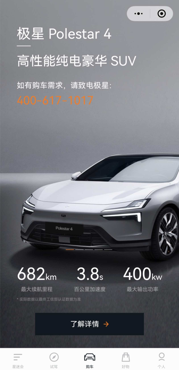 极星汽车小程序上未显示购车入口。极星汽车小程序截图